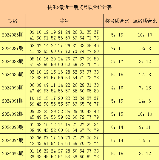 福彩快乐8第2024095期开出奖号:01 16 22 24 27 28 30 34 37 38 39 43 45 52 54 58 59 60 69 73,其中奖号质合比为5:15,奖号尾数质合比为8:12。