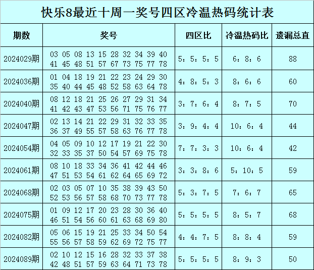 福彩快乐8第2024089期(上周一)开奖回顾:02 10 12 15 16 28 32 33 37 38 42 48 51 57 59 63 64 71 73 78,其中奖号四区比为5:5:5:5,冷温热码比为3:9:8。