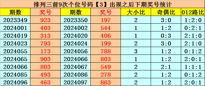 个位前9次开出号码3时,该位下期奖号分别为:7-4-6-9-8-3-9-8-3,其中号码个数大小比是6:3,012路比是5:2:2,奇偶比是5:4。