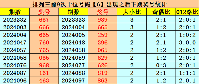 在十位前9次出现号码6后,其下期奖号分别开出:8-6-5-9-6-2-2-1-6,其中奖号个数大小比是6:3,012路比是4:1:4,奇偶比是3:6。