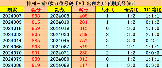 百位号码:百位上期奖号为0路、奇数、小号:8,历史上百位号码8共开出729期,前一次开出期数在第2024088期,上期奖号隔8期再次开出。