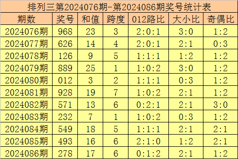 开奖回顾:排列三第2024097期奖号开出:863,组选类型:组六,大小比为2:1,奇偶比为1:2,和值为17,跨度为5。