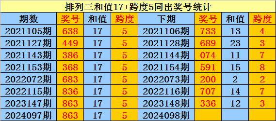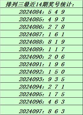 上期回顾:排列三第2024097期奖号:863。和值17,跨度5。