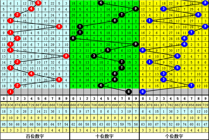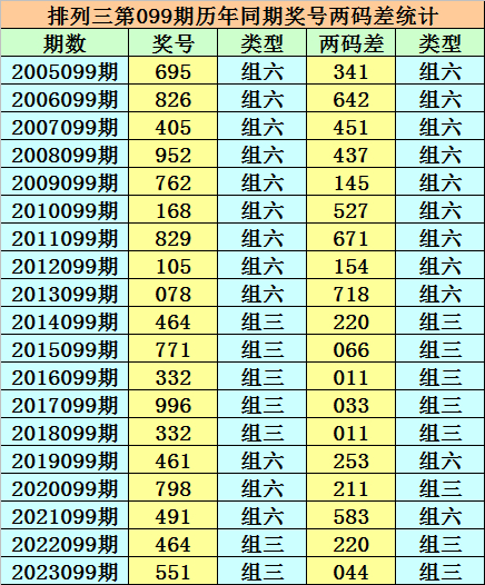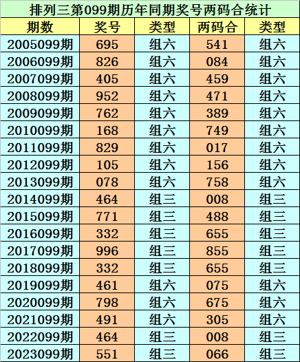 排列三从2004年开奖至今已开出6870期奖号了,其中第099期历史同期奖号出现19次,历年第099期分别开出号码:695、826、405、952、762、168、829、105、078、464、771、332、996、332、461、798、491、464、551。