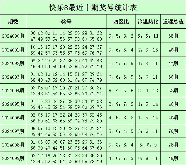福彩快乐8第2024099期开奖回顾:02 12 16 20 23 31 33 34 35 39 42 45 52 53 54 58 60 66 78 79,其中奖号四区比为4:6:7:3,冷温热码比为0:9:11,遗漏总值为45。