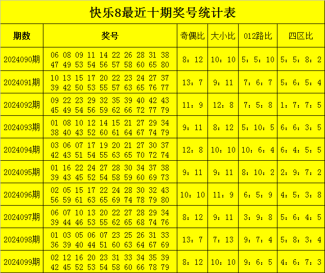 福彩快乐8第2024099期开奖回顾:02 12 16 20 23 31 33 34 35 39 42 45 52 53 54 58 60 66 78 79,其中奖号大小比为10:10,012路比为9:6:5,和值为832,跨度为77,奇偶比为8:12。