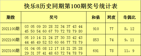 和值分析:历史同期第100期奖号和值出现范围在691-910之间,波动了219个点位,和值均值为818,去年同期和值开出691,下降了162个点位,相比于去年同期和值,今年第100期和值预计波动范围,继续在691附近出现。