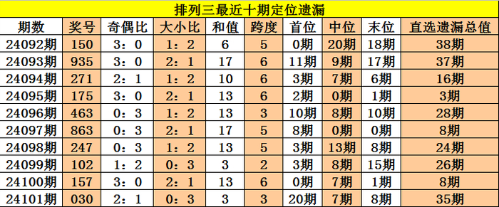 开奖回顾:排列三第2024101期奖号:030,定位直选遗漏值20期、7期、8期,遗漏总值为35期。
