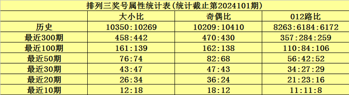 上期回顾:排列三第2024101期奖号为030,奖号012路比为3:0:0,奇偶比为1:2,大小比为0:3,和值为3,跨度为3。