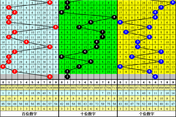 大中小分析:在组选0-9号码分布图中,前10期小号(0-2区段)出现12枚奖号,中号(3-6区段)出现12枚奖号,大号(7-9区段)出现6枚奖号,上期大号区域轮空,本期预计大中小区域各出1枚奖号。