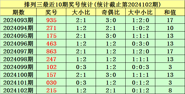 上期回顾:排列三第2024102期奖号为:215。奖号类型:组六,和值:8,奇偶比:2:1,跨度:4,大小比:1:2。