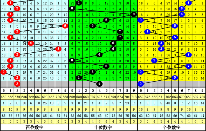 目前百位最冷号码为7,当前遗漏40期,该号码历史最大遗漏为64期,本期百位防号码7解冻。