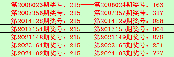 排列三第2024102期开出奖号215,该号码直选类型历史上出现了7次,前6次开出之后期下期奖号为:163、317、088、004、878、251,见下表: