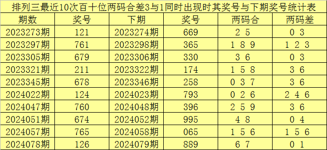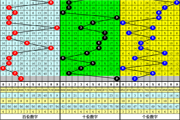 从以上统计可以看出,百十位两码合差3与1同时出现之后其下期两码合差表现最热的4个分别为:0136,本期百十位两码合差可以参考这四码中的数据。