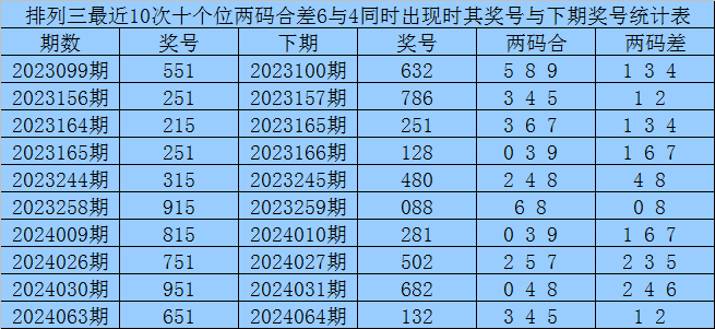 从以上统计可以看出,十个位两码合差6与4同时出现之后其下期两码合差表现最热的4个分别为:1348,本期十个位两码合差可以参考这四码中的数据。