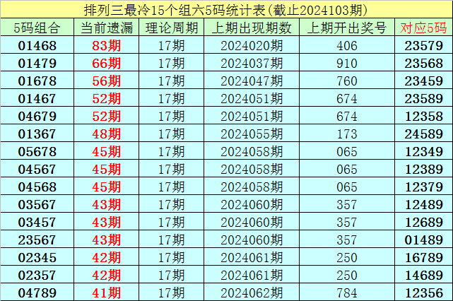 (1)目前排列三5码组六遗漏期数最大的组合为:01468,目前轮空83期;