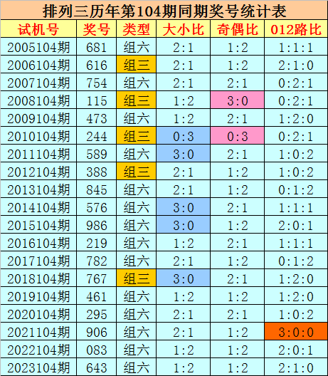 组选类型推荐:历史上排列三第104期同期奖号中,组六出现14期,组三出现5次,今年第104期预计奖号为组六号码。