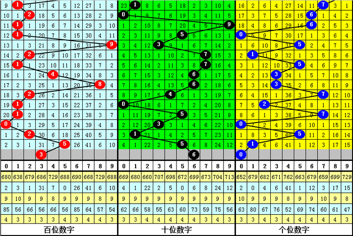 号码个数分析:历史上排列三第104期同期奖号中,号码0-9出现个数分别为:号码0开出2个,号码2、3开出4个,号码9开出5个,号码1、5、7开出6个,号码4开出7个,号码8开出8个,号码6开出9个,今年第104期排除号码5。