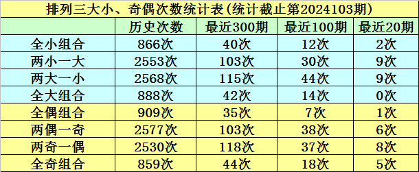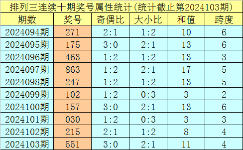 上期回顾:排列三第2024103期奖号:551。类型:组三,奇偶形态:奇奇奇,大小形态:大大小,和值:11,跨度:4。