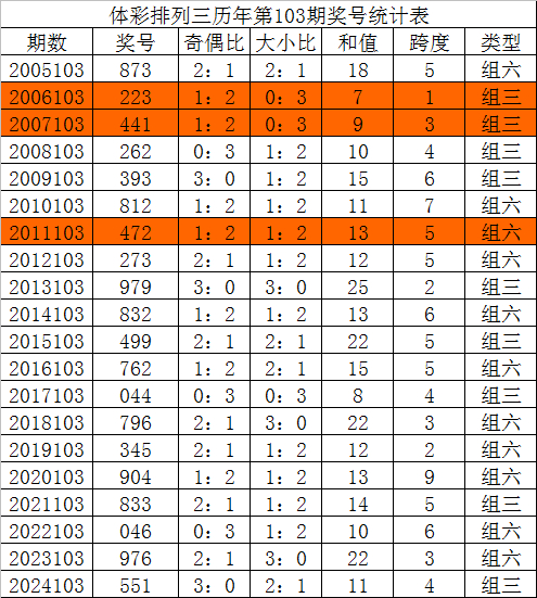 排列三第2024103期奖号为551,奇偶比为3:0,大小比为2:1,和值为11,跨度为4。