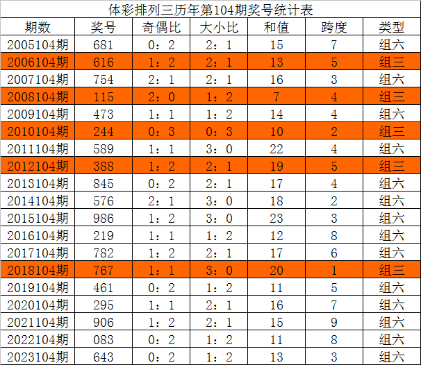 体彩排列三历年第104期开出奖号分别为:681、616、754、115、473、244、589、388、845、576、986、219、782、767、461、295、906、083、643。统计详见下表: