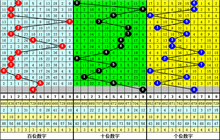 出现次数最少的三个号码分别为:0、2、3,本期预计这三个号码不会同时出现,排除号码:0。
