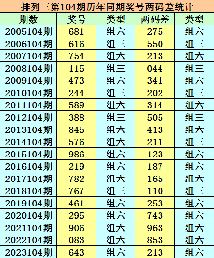 在排列三第104期历史同期开奖中,各号码两码差分别为:257、055、123、044、134、022、134、055、134、112、123、178、156、011、235、347、369、358、123;