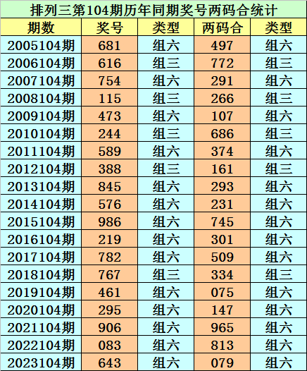 排列三从2004年开奖至今已开出6875期奖号了,其中第104期历史同期奖号出现19次,历年第104期分别开出号码:681、616、754、115、473、244、589、388、845、576、986、219、782、767、461、295、906、083、643。