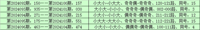 统计排列三已开出的奖号发现,在连续5期(第2024092期-第2024096)奖号为:150-935-271-175-463。