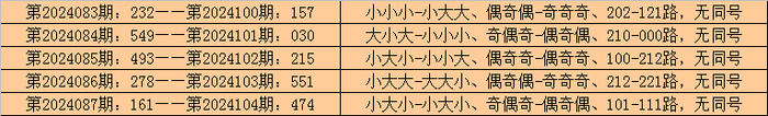 在排列三历史开奖中,第2024083期-第2024087期连续5期奖号为:232-549-493-278-161。