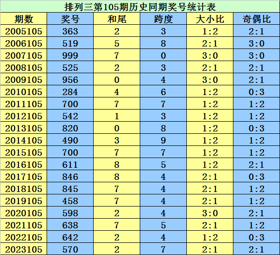 历年第105期排列三同期奖号开出:363、519、999、525、956、284、700、542、820、490、700、611、846、845、458、598、638、642、570。