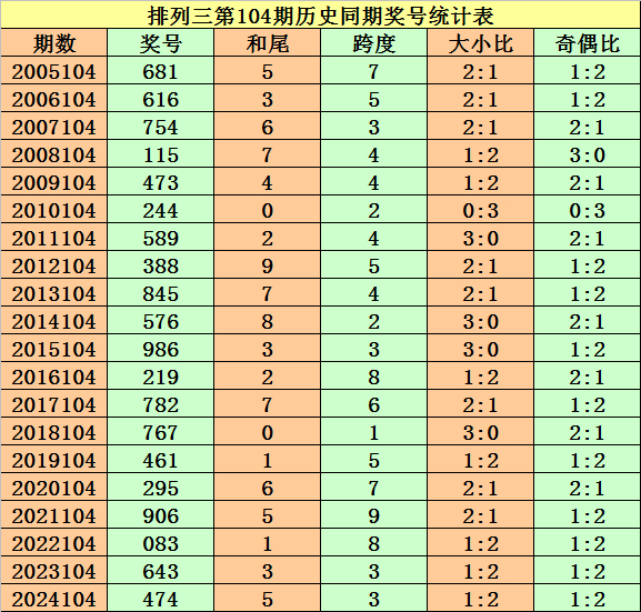 从2004年至今排列三已开出6876期奖号了,本期为排列三2024年第105期开奖,历史同期已出现19次奖号:
