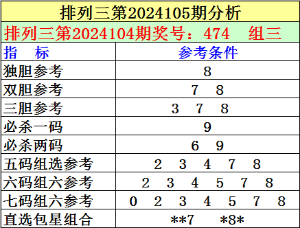 1.排列三最近十期分别开出号码:175-463-863-247-102-157-030-215-551-474,其中有5期奖号开出了上期的重复号码,本期预计第2024104期奖号:474中有重号,参考号码:7。