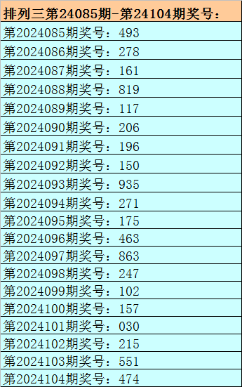 开奖回顾:排列三第2024104期开出奖号:474。其中奖号大小比为1:2,奇偶比为1:2,012路比为0:3:0,和值为15,跨度为3。