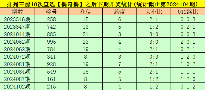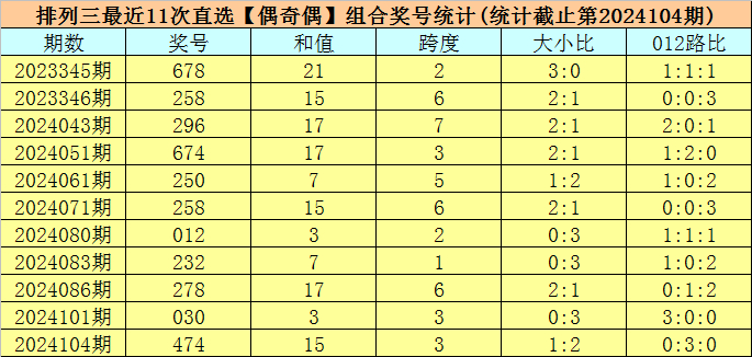 排列三上期奖号为474,开出奇偶类型为【偶奇偶】,前10次【偶奇偶】类型奖号分别开出:678、258、296、674、250、258、012、232、278、030;