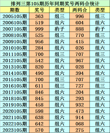 排列三从2004年开奖至今已开出6876期奖号了,其中第105期历史同期奖号出现19次,历年第105期分别开出号码:363、519、999、525、956、284、700、542、820、490、700、611、846、845、458、598、638、642、570。