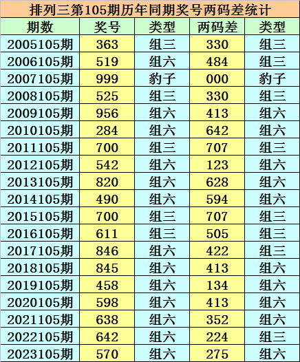 在排列三第105期历史同期开奖中,各号码两码差分别为:033、448、000、033、134、246、077、123、268、459、077、055、224、134、134、134、235、224、257;