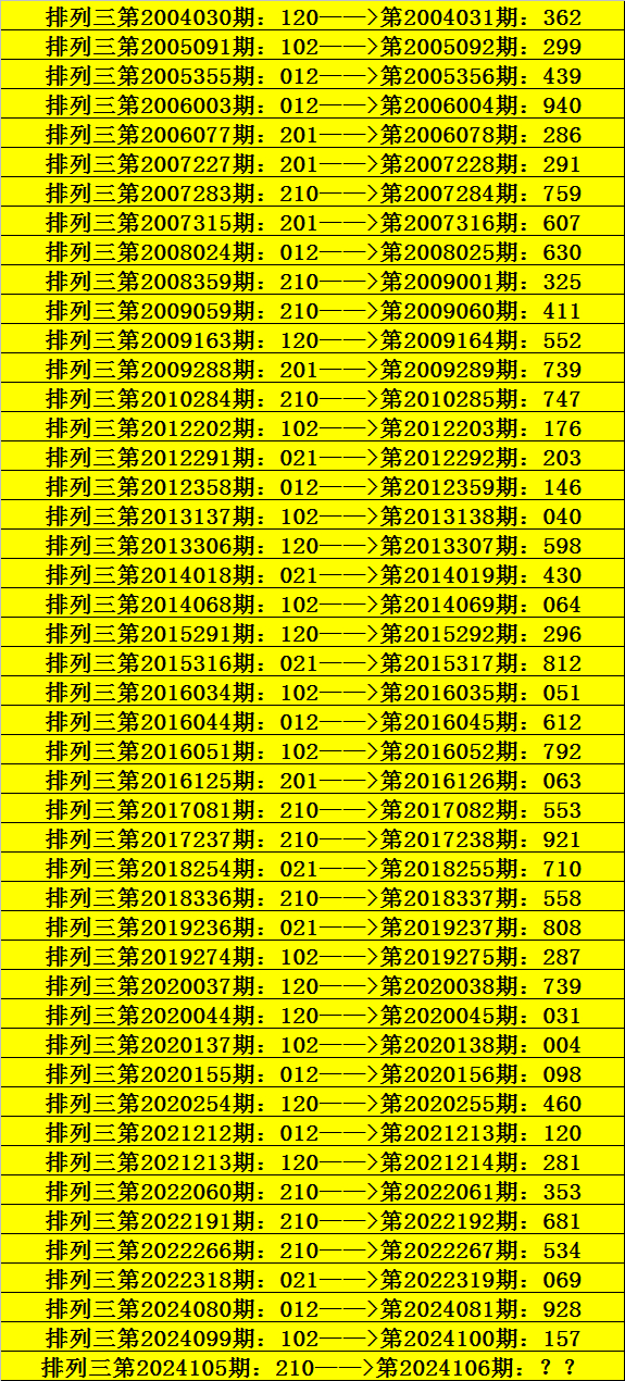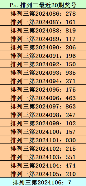 第2024105期排列三奖号为210,历史上该号码组选开出47次,下期奖号分别为:362、299、439、940、286、291、759、607、630、325、411、552、739、747、176、203、146、040、598、430、064、296、812、051、612、792、063、553、921、710、558、808、287、739、031、004、098、460、120、281、353、681、534、069、928、157。