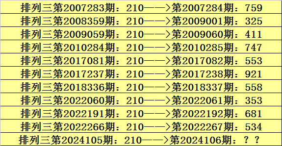 第2024105期排列三奖号为210,历史上该号码直选出现11次,下期奖号分别为:759、325、411、747、553、921、558、353、681、534。