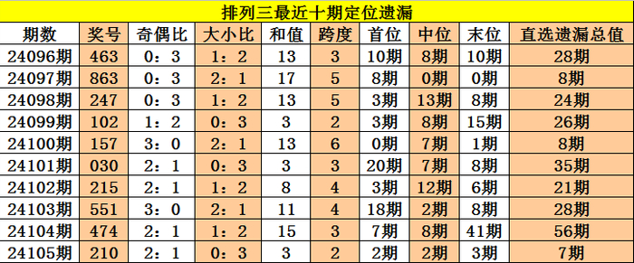 开奖回顾:排列三第2024105期奖号:210,定位直选遗漏值2期、2期、3期,遗漏总值为7期。