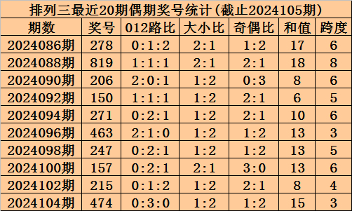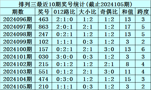 上期回顾:排列三2024105期奖号为210,奇偶比为1:2,大小比为0:3,跨度为3。