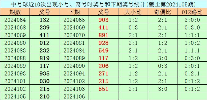 中号球:上期奖号为1,开出小号、奇号,该位前10次开出小号、奇号的现象时其奖号分别为:132、239、411、012、232、819、117、935、030、215,其中中号球012路比为5:5:0。