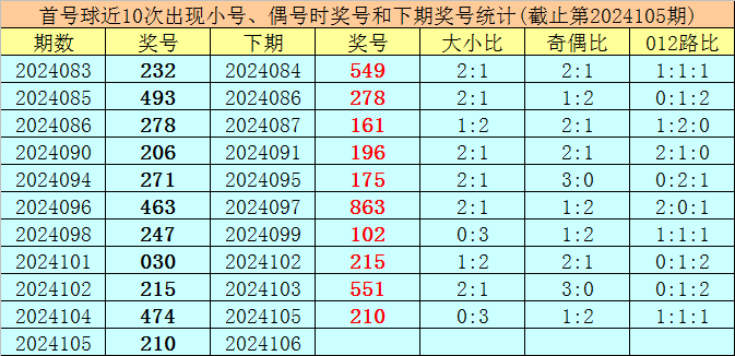 在首号球前10次开出小号、偶号类型之后,其下期分别开出奖号:549、278、161、196、175、863、102、215、551、210,其中号码奇偶比为6:4,大小比为3:7,012路比为0:4:6。
