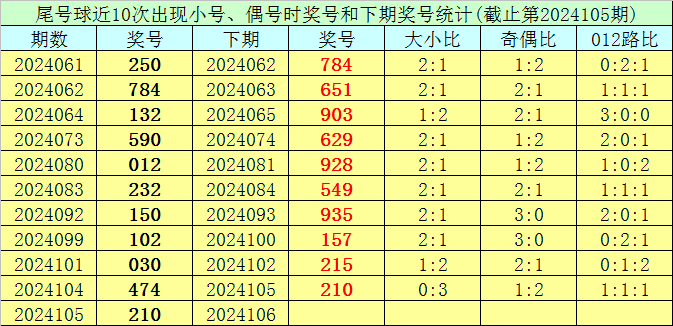 在尾号球前10次开出小号、偶号类型之后,其下期分别开出奖号:784、651、903、629、928、549、935、157、215、210,其中号码大小比为6:4,012路比为4:3:3,奇偶比为7:3。
