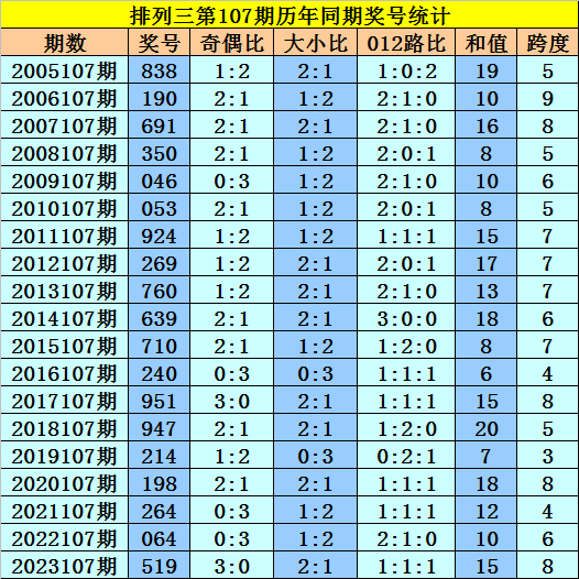 本期为排列三第2024107期开奖,历史上排列三第107期已开出了19期奖号了: