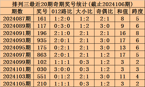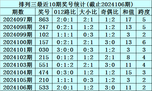 上期回顾:排列三2024106期奖号为533,奇偶比为3:0,大小比为1:2,跨度为11。