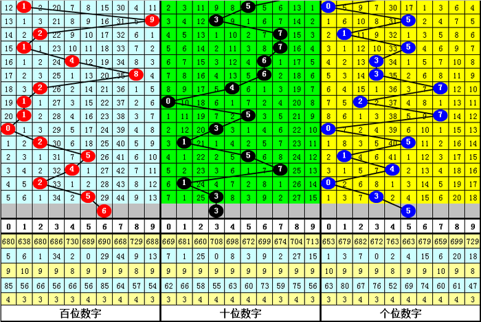 百位分析:该位上期奖号为5,出现2路、奇数、大号,在前11期奖号,该位012路比为1:4:6,0路号码最少,目前012路号码遗漏期数分别为5、2和0,近期百位注意0路号码走热。