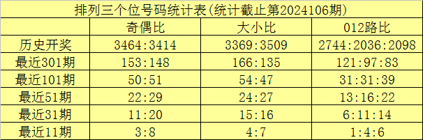 上期回顾:排列三第2024106期奖号为:533。奖号形态组三,大小比1:2,奇偶比3:0,012路2:0:1。