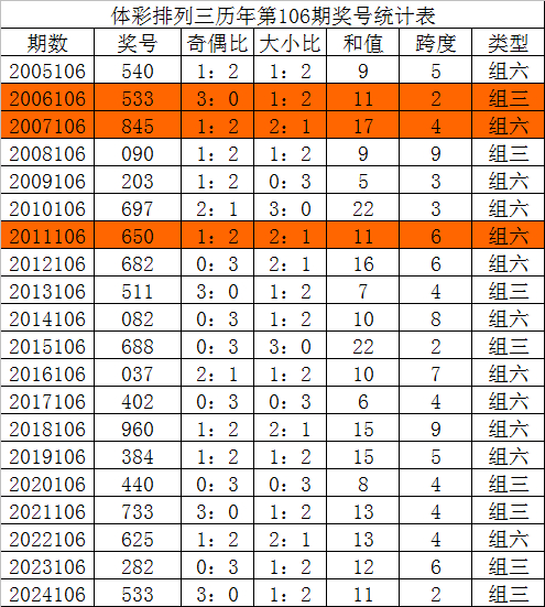 排列三第2024106期奖号为533,奇偶比为3:0,大小比为1:2,和值为11,跨度为2。
