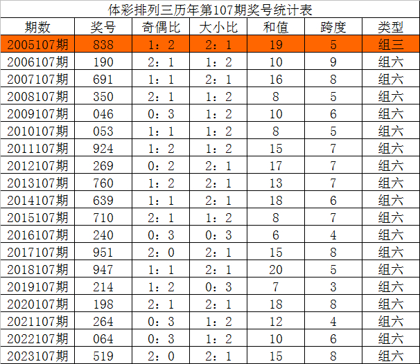 体彩排列三历年第107期开出奖号分别为:838、190、691、350、046、053、924、269、760、639、710、240、951、947、214、198、264、064、519。统计详见下表: